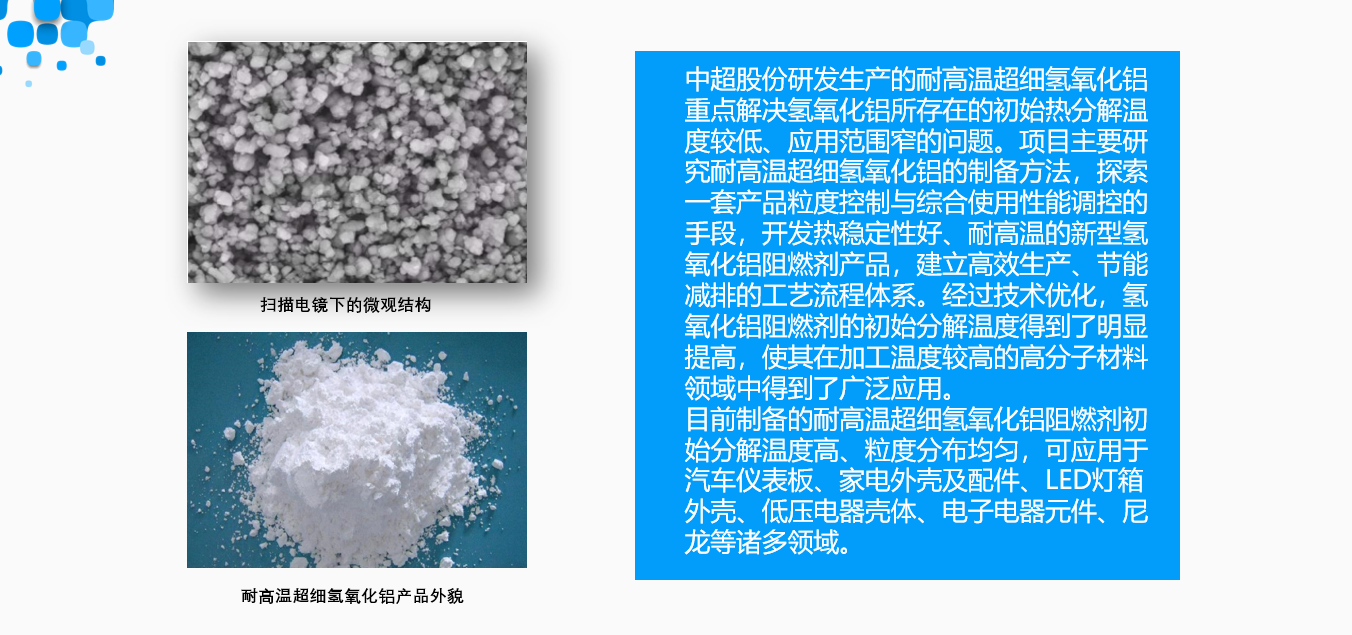 中超股份研發(fā)生產(chǎn)的耐高溫超細(xì)氫氧化鋁重點(diǎn)解決氫氧化鋁所存在的初始熱分解溫度較低、應(yīng)用范圍窄的問題。項(xiàng)目主要研究耐高溫超細(xì)氫氧化鋁的制備方法,探索一套產(chǎn)品粒度控制與綜合使用性能調(diào)控的手段,開發(fā)熱穩(wěn)定性好、耐高溫的新型氫氧化鋁阻燃劑產(chǎn)品,建立高效生產(chǎn)、節(jié)能減排的工藝流程體系。經(jīng)過技術(shù)優(yōu)化,氫氧化鋁阻燃劑的初始分解溫度得到了明顯提高,使其在加工溫度較高的高分子材料領(lǐng)域中得到了廣泛應(yīng)用。